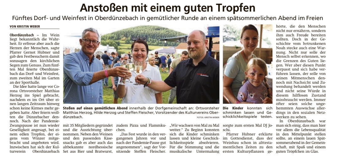 Oberdünzebach - Die Vereine und das Dorfleben sterben aus? Nicht so in Oberdünzebach. Am vergangenen Samstag richteten die Vereine des Eschweger Stadtteils zusammen mit dem Ortsbeirat das 1. Oberdünzebacher Dorf- & Weinfest aus. Auf Vorschlag von Ortsvorsteher Matthias Herzog taten sich alle Vereine des Dorfes, darunter die Feuerwehr, der Sportverein, der Schützenverein und der Heimatverein, zusammen und planten unter Leitung von Festausschussvorsitzenden Steffen Fleischer seit Anfang des Jahres die gemeinsame Veranstaltung. "Wir hatten schon ein wenig Bedenken, ob die Werbemaßnahmen greifen", so Fleischer, "aber dann waren wir total überwältig und glücklich über die zahlreich erschienenen Gäste. Ungefähr 300 Personen habe ich gezählt und ich denke, wir haben den Ansturm trotzdem sehr gut bewältigt." Neben Bier und Bratwurst waren auch Steak, Käse, Brezeln und Zwiebelkuchen im Angebot. Extra angereist war das Weingut Münchhof aus Ockenheim mit einer großen Auswahl an Weinen. Zusätzlich zum geselligen Teil war für die Kinder auch ein Laserschiessstand aufgebaut und es gab eine Andacht von Herrn Pfarrer Gernot Hübner. "Wir sind wirklich froh über den Ablauf und werden im nächsten Jahr auf jeden Fall wieder ein Weinfest veranstalten", erklärt Fleischer. Weitere Informationen, auch über die Veranstaltung im nächsten Jahr, sind unter facebook.com/weinfestobd zu finden.